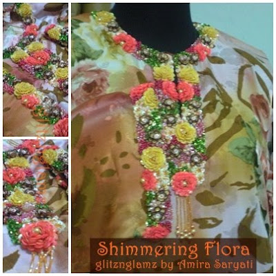 Baju kali ini adalah ditempah khas oleh rakan saya untuk ke majlis konvokesyen beliau. Alhamdulillah, dia sangat berpuas hati pabila baju yang telah siap sampai ditangannya. Rekaan kali ini saya tekankan kepada rekaan yang lebih menjalar ke atas berbanding dengan rekaan biasa yang selalunya hanya satu garis/ lebar sahaja. Manik tabur merupakan salah satu corak yang mudah untuk dibuat bagi memenuhi sesuatu kawasan, maka dengan itu, saya memilih untuk membuat manik tabur dengan bentuk segitiga di antara bunga-bunga.
